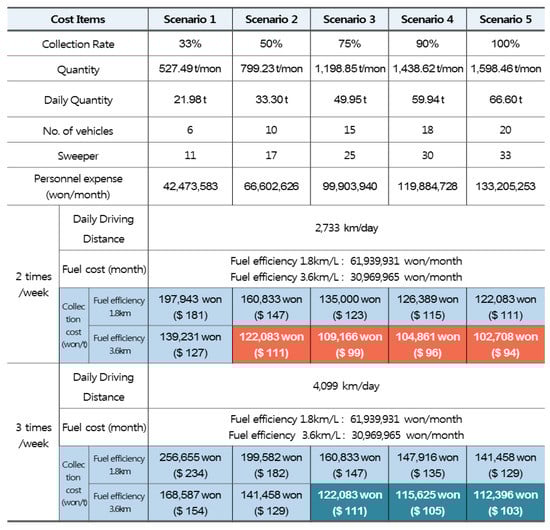 Based on the assumption that a collection trial will be expanded to include all of the daycare centers in Seoul, the costs of collection/transportation are calculated as follows. The variables include the quantity of diaper waste, frequency of collections and mileage of vehicles. Based on the number of children in Seoul as provided by the National Statistics Office, the quantity of diaper waste generated can be estimated at 53.28 tons per day, or 1598 tons per month. In Nowon-Gu and Gangseo-Gu, which have the largest numbers of children in Seoul, approximately 100 tons of diaper waste can be expected every month. First, the total quantity of diaper waste generated by the daycare centers in Seoul is calculated. Second, the rate of collection is increased from 33% to 100%. Third, for two scenarios, we set the frequency of collections as twice and three times a week. And fourth, we set two mileage rates for the vehicles as 1.8 km/L and 3.6 km/L. Using this research result, we calculated the cost by setting the variables of collection quantity, collection frequency and fuel efficiency and changing the options when applying the results of an extended application throughout Seoul. It was not perfect because it did not reflect all variables. It is more correct to say that the scenarios are options by collection method. The various options were intended to see what was appropriate in Korea. As a result, the scenario for collecting diaper waste three times a week estimates the cost of collection/transportation between 112,396 won ($103)/ton and 256,655 won ($234)/ton, while that for collecting twice a week puts it between 102,708 won ($94)/ton and 197,943 won ($181)/ton. Realistically, it is difficult to collect more than 70–80% of waste such as diapers generated by a certain group of consumers, so it will be more economically feasible to operate highly efficient collection vehicles twice a week (Figure 4).