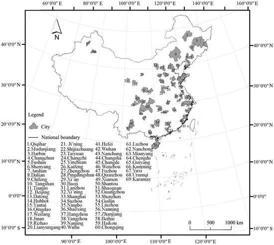 High concentrations of PM2.5—much higher than the 10 µg/m3 standard set by World Health Organization (WHO) air quality guidelines—occurred over a vast region of China since 1999, ranging from southern Inner Mongolia to Guangdong latitudinally, and from the east coast to central Sichuan longitudinally, plus the southern part of Xinjiang Province [9,11]. In this study, we selected 69 cities across this region based on data availability (Figure 1).