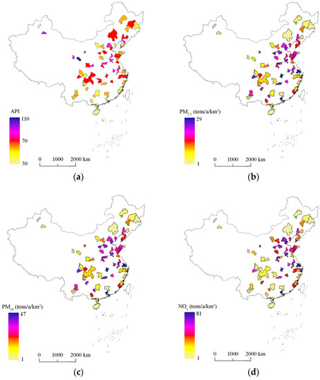 High values of API occurred in most of the 69 cities of China, especially those in the Northeast, the Beijing-Tianjin-Hebei region, and central Sichuan, plus Urumqi in Xinjiang Province (Figure 2a). High emissions of PM2.5, PM10, NOx, and SO2 occurred in cities located in the North China Plain (Beijing, Tianjin, Hebei, Shandong, Henan, northern Jiangsu, and northern Anhui) and the middle and lower reaches of the Yangtze River Basin (Figure 2b–e). Moreover, a large amount of SO2 was emitted from those cities located in the Sichuan Basin (Figure 2e).