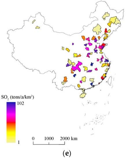 (a–e) Maps of (a) Air Pollution Index (API) and emissions of (b) PM2.5, (c) PM10, (d) NOx, and (e) SO2 in 69 Chinese cities, 2010.