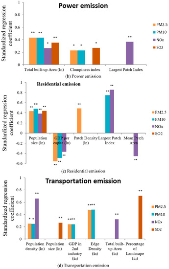 Standardized stepwise regression coefficients for predicting emissions of PM2.5, PM10, NOx, and SO2 based on socioeconomic and urban from factors. ** p-value < 0.01, * p-value < 0.05.