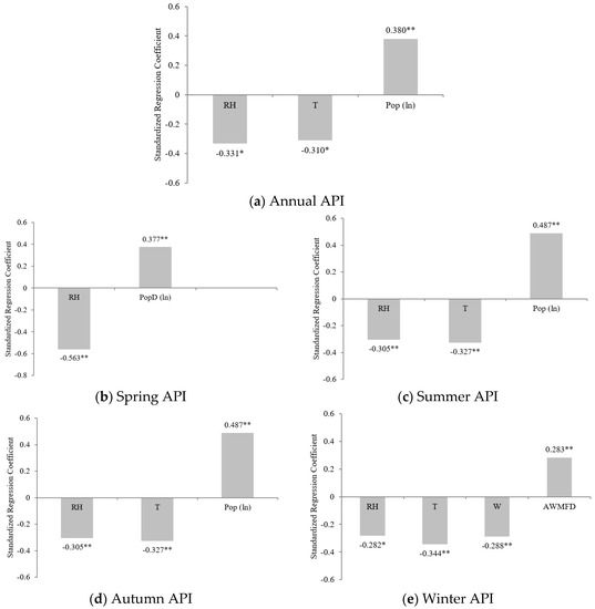 In general, API levels were positively correlated with socioeconomic factors (e.g., population size and density) and urban form metric (e.g., AWMFD), but negatively with climatic factors (e.g., humidity, precipitation, temperature, and wind). More specifically, the adjusted R2 value of regression models for annual API was 0.408 (p-value < 0.001) (Table 3). The annual API was positively correlated with population size but negatively with relative humidity and temperature (Figure 4a). The values of adjusted R2 of regression models for seasonal API were 0.309 (p-value < 0.001) in spring, 0.269 (p-value < 0.001) in summer, 0.124 (p-value = 0.005) in autumn, and 0.359 (p-value < 0.001) in winter (Table 3). Spring API was positively correlated with population density but negatively with relative humidity (Figure 4b); summer API was positively correlated with population size but negatively with relative humidity and temperature (Figure 4c); autumn API was positively correlated with population size but negatively with precipitation (Figure 4d); and winter API was positively correlated with AWMFD but negatively with humidity, temperature, and wind speed (Figure 4e).