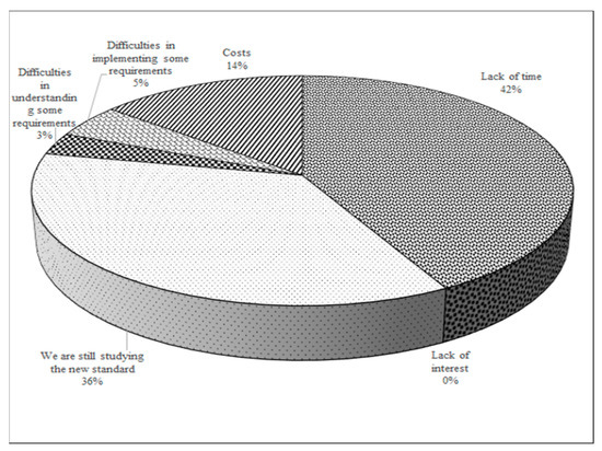 When the survey was completed online, around three quarters of the respondent organizations had not transitioned to the 2015 revision (Figure 5) due to lack of time and mandatory study and analysis of the novel requirements (Figure 6). However, the majority of the respondent organizations (97%) intend to proceed with the transition before the three-year transition period, with essentially the majority of the organizations expecting to have transitioned by 15th September 2018 (Figure 7). In addition to the major reasons pointed out previously, those organizations that did not proceeded with the transition point out some difficulties in understanding and implementing some requirements and the ascribed costs inherent to the transition process.
