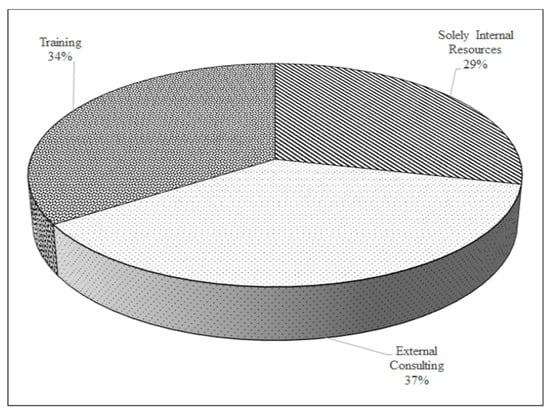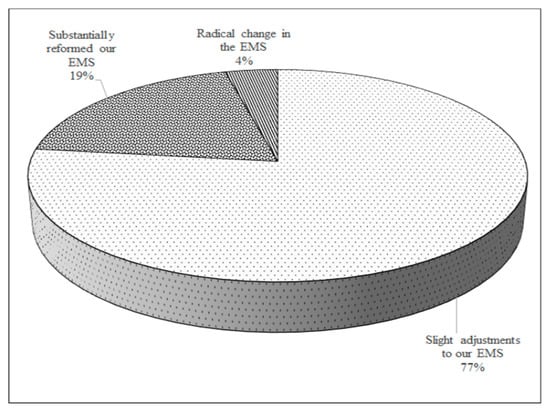 The results suggest that no particular resource/strategy was favored over other (Figure 10) and a considerable proportion (around 77%) of the surveyed organizations that proceeded with the transition to the ISO 14001:2015 introduced slight adjustments to the pre-existing EMS (Figure 11). Approximately one-third of the organizations proceeded with the transition and were supported solely on the available internal resources. The remaining organizations reported the support of external consultants, who carried out some training sessions focusing on the ISO 14001 new requirements (Figure 10).