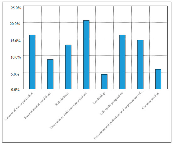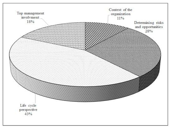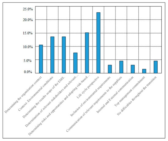 Concerning the difficulties faced by the organizations (Figure 12) when implementing the new revision requirements, approximately one-quarter of the respondents pointed out the implementation of the life cycle perspective. Other noticeable items pointed out were: “risk management approach”, “context–environmental conditions” and “determining results of EMS”. Regarding the most useful concepts, nearly one-fifth of the companies found the determination of risks and opportunities, the life cycle perspective and the mapping of the context of the organization the most relevant added values (Figure 13).