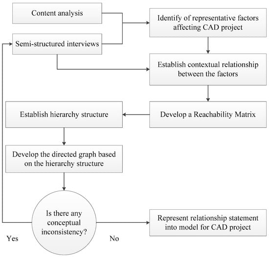 The major purpose of this stage is to build a hierarchy structure between the representative elements by employing the ISM method. ISM is an interactive learning process [51]. This technique is used to describe complex relationships among a set of different directly- and indirectly-related elements by constructing a carefully designed pattern implying graphics and words [56,57]. Figure 1 illustrates the procedures of applying the ISM method.