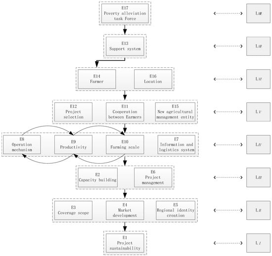 As a result, the ISM method classified the 17 elements into eight levels (see Figure 2). Elements including E1 (project sustainability), E2 (capacity building), E3 (coverage scope), E4 (market development), E5 (regional identity creation), and E6 (project management) are at the bottom three levels (I–III) of the ISM hierarchy. It indicates that these six elements are highly dependent on other elements. There are four elements in the top three levels (VI–VIII). E13 (support system), E14 (farmer), E16 (location), and E17 (PATF) are the most essential elements affecting the successful implementation and sustainable development of CAD projects in rural China. In other words, achieving high efficiency and effectiveness performance by the project manager in addressing these four elements will benefit rural communities and poor households to a large extent. Elements positioned in inter-medium level (IV–V) are E7 (information and logistics system), E8 (operation mechanism), E9 (productivity), E10 (farming scale), E11 (cooperation between farmers), E12 (project selection), and E15 (NAME). They are affected by the top level elements and will, in turn, exert an influence on the bottom level elements. Additionally, there are interactions between elements E8 (operation mechanism), E9 (productivity), and E10 (farming scale) at level IV.