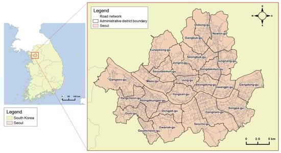 Seoul is a vibrant capital city that has historically attracted people and commerce. As a political and economic center, Seoul is the largest metropolis in and the capital of South Korea. The 2015 population of Seoul was 10.3 million and the metropolitan area had 25.5 million people, which is half the population of Korea [25]. At 605.2 km2, 0.6% the total area of Korea, and a population density of 17,014 persons per square kilometer, Seoul is one of the most densely populated cities in the world. It is comprised of 25 gu (local government districts) and the study area covers the entire city (Figure 1).