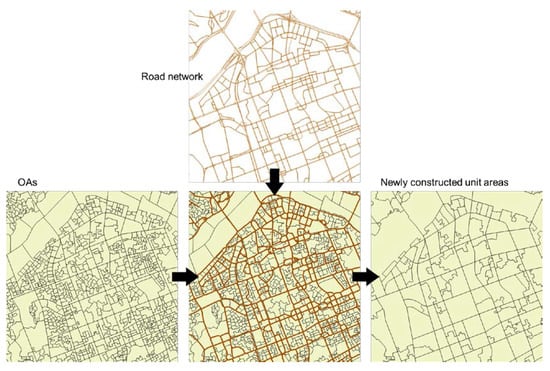 OAs and grids are widely used as the units of analysis. In urban environments, however, the segmentation of an urban area based on a road network is more natural than other criteria. Since people usually live in road-segmented regions and travel among road-segmented regions, we aggregated the OAs of the study area with the road network using the road-based segmentation method [30]. For this, we extracted the road-network data provided by the Korean Ministry of Land, Infrastructure and Transport (MOLIT). Aggregated OAs (AOAs) by the road network are considered as a basic unit of our study on the assumption that the road-segmented regions are the bases of daily activity and human mobility (Figure 2).