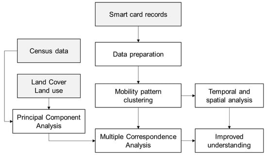 The rest of the paper is organized as follows: Section 2 describes the study area and the datasets considered: smart-card data and local environmental data (land-use and socio-demographic data); Section 3 presents the methodology defined for the mobility-pattern analysis and its relationship to local environments; and the discussion and conclusion are given in Section 4 and Section 5, respectively.