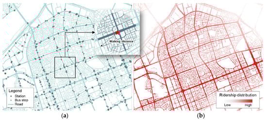 Point data containing ridership (a) and the results of ridership distribution along the streets (b).