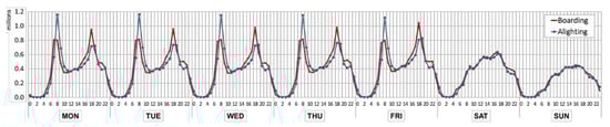 Figure 6 presents the total boarding and alighting counts of the study area: the temporal pattern for public transportation. The temporal pattern for public transportation refers to the boarding and alighting counts over time. The temporal pattern during weekdays exhibits a bimodal shape over a day. During the morning rush hour, the alighting pattern has the highest peak point between 08:00 and 09:00. In comparison, the boarding counts during 07:00–08:00 and 08:00–09:00 have similar values. During the evening rush hour, the boarding pattern has the highest peak point between 18:00 and 19:00 while the alighting counts during 18:00–19:00 and 19:00–18:00 are similar. This reflects commuting time from boarding to alighting, and clearly shows the use of public transportation for commuting during general working hours in Korea (09:00–18:00). Meanwhile, the temporal patterns during the weekend are much smoother than those of weekdays and similar for both boarding and alighting. The fact that the temporal patterns are grouped into two i.e., weekdays (Mon-Fri) and the weekend (Sat-Sun) can be visually identified.