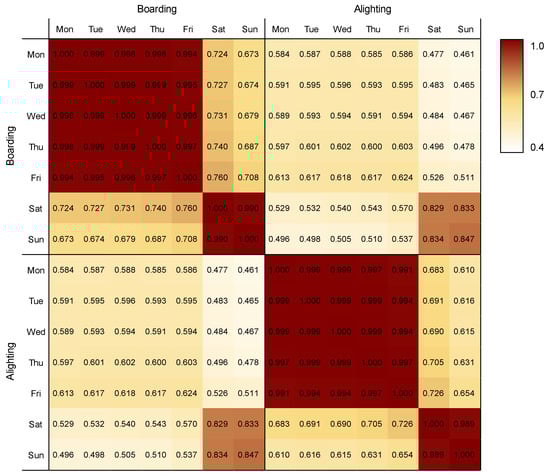 It can be numerically confirmed that the temporal patterns can be separated into two groups through Pearson’s correlation coefficients, as shown in Figure 7. In the case of weekdays, boarding or alighting patterns have strong correlations (0.991–0.999). For the weekend, temporal patterns are also highly correlated (0.989–0.990). Meanwhile, the correlation between boarding and alighting patterns of weekdays is relatively low (0.584–0.624); and the correlation between the boarding and alighting pattern of the weekend is higher than that of weekdays (0.829–0.847). Since the patterns between weekdays and the weekend are distinct, we further analyzed the commuting patterns using two categories (i.e., weekday and weekend).