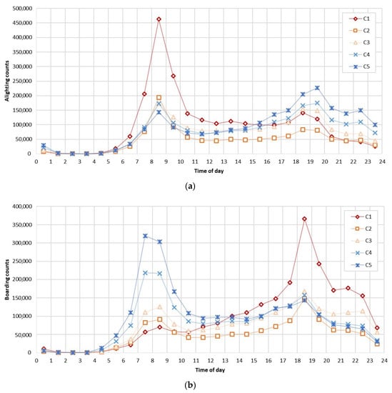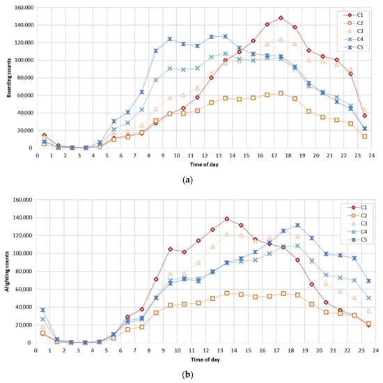 In C1, there was a great influx of people between 09:00 and 14:00 and many people moved out of C1 from late afternoon until night. Also, the highest peak points of boarding and alighting are in C1, which means many people visit C1 during the weekend as well as weekdays. C2 has the least percentage of people who utilize public transport, exhibiting no discernible peaks. C3 showed a similar pattern with C1, having higher alighting counts than C1 in the evening to night. C2 is the region that attracts a substantial number of people even later in the evening. C4 and C5 have opposite trends of C1 and C2. Although the boarding and alighting of C5 is higher than those of C4, their patterns are similar to each other. Lots of people ride public transportation in the morning and alight in the evening; many people in C4 and C5 leave these areas in the morning and return in the evening to night.