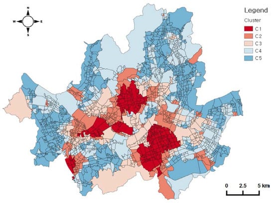 Table 3 shows the mean values of a set of socio-demographic, land-use and transportation characteristics of each identified cluster. C1 has the highest concentration of companies, more than two times that of the other clusters, and consequently the lowest population. C2 has the highest industrial area. C5 has the highest number of residents and the highest residential area. C5 also has the lowest commercial area and the lowest value of aging. C3 and C4 have the third and second highest population and almost half of their area is residential. An important difference between these two clusters is the concentration of companies. C3 also has the second highest number of businesses. In terms of transportation characteristics, C1 and C5 are characterized by a large number of public transportation users. C2 has the lowest passengers even though the population and residential area of C2 are higher than those of C1. Since C1 has more than twice the number of employees compared to C2, it can be considered that the number of employees has a large influence on the number of passengers. Besides, C2 has the smallest number of subway stations. It was observed that the number of public-transportation users is positively correlated to the number of subway stations.