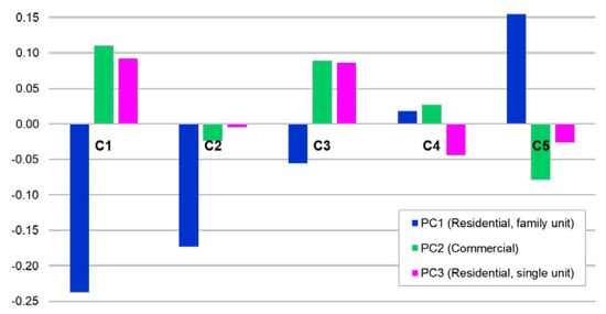 For each cluster of the travel patterns, the average values of newly constructed variables: PC1, PC2, PC3, are plotted in Figure 11. With regard to the pattern of C1 areas, the residential function (family unit) component is the lowest and the commercial function component is higher than the other clusters. This indicates that these local environmental characteristics tend to attract people in the morning but drive them out in the evening. For C5, the residential function component is the highest and the commercial function component is the lowest in clusters, indicating that areas of C5 tend to be associated with residential-dominated areas rather than commercial areas. C2, C3, and C4 have moderate characteristics. Out of them, C3 has similar pattern with C1; negative PC1, positive PC2 and PC3. This is likely to be linked to the similar temporal pattern of C1 and C3 during the weekend, as discussed in previous section.