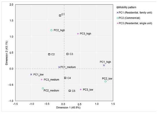 In order to further analyze the relationship between mobility patterns and environmental characteristics, a correspondence analysis is applied. We categorize each PC value into three, high, medium, and low, according to normalized values of the three components. The graph from the correspondence analysis, as shown in Figure 12, shows the relationship between the clusters identified by mobility patterns and local environmental characteristics. In the graph, trip patterns are represented by black rectangles, and socio-demographic variables are in various shapes. This shows that C1 is quite close to PC2-high, indicating that this area tends to be located in commercial areas. Both C2 and C3 are close to PC1-medium. But C3 is closer to PC3-high than the other clusters, indicating that C3 tends to have a residential function in single units such as one-person households. C5 is close to PC3-low, indicating that C5 has a family unit residential function. A visual inspection of the CA bi-plot revealed that the locations of trip patterns and local environmental variables show similarities between them.