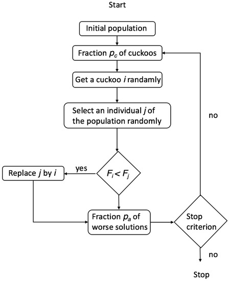 Firstly proposed by Yang and Deb in 2009 [31], the standard Cuckoo Search algorithm (CS) is a meta-heuristic algorithm inspired by the interesting parasitism of cuckoo species and originally developed for solving multimodal functions. CS algorithm can be summarized as three ideal rules: (1) The egg, laid by each cuckoo in the randomly selected nest, represents a random solution; (2) At the end of each iteration (generation), the best nest with an egg of high quality is kept for the next generation, in other words, the solution with the best fitness is preserved; (3) The number of available host nests is fixed, and the cuckoo’s egg might be found by the host bird with certain probability . If the egg is found, the host bird will throw out the alien egg or abandon its nest so that the egg will not be hatched. In the CS Algorithm, this phenomenon can be described in an easier way that a fraction of the current set of solutions is replaced by randomly generated solutions. A solution is generated from solution of cuckoo i by performing a Lévy flight: