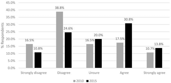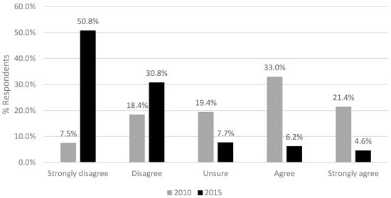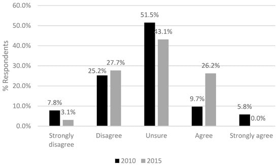 When winegrowers were asked whether they had biosecurity measures in place for wine tourists in 2015 (Table 10), 30.8% of participants believed that the current measures that they employed were adequate, which is an 8.5% increase from the 2010 figure, and an advance on the 2003 survey, which showed that only 11.9% of wineries had biosecurity measures in place. These figures highlight that there is a significant gap in the actions taken by wineries and the potential biosecurity threats they face from winery visitation, which poses a risk because visitors may be vectors for disease or an exotic species [,]. Nearly half of the New Zealand wineries surveyed report that visitors are able to wander freely among their vines. This attitude towards risk mitigation suggests that a more cautious approach that is underpinned by a higher level of awareness with regard to the consequences that a disease outbreak could have for the New Zealand wine industry is required. In 2015, just under half of the wineries surveyed (43.1%) indicated that they were unsure of whether the current level of information available regarding biosecurity threats that they received was adequate, which was a figure similar to that of the previous survey (Figure 3). Nevertheless, 55.4% of wineries surveyed in 2015 believed that there was no need for a biosecurity component within the SWNZ scheme, which could be a potential avenue to better communicate biosecurity management to winegrowers, especially given that one of the key objectives of the New Zealand Winegrowers biosecurity strategy is ensuring that “members’ awareness of biosecurity risks and mitigations is maximised” [] (p. 21). Without protection from disease or invasive species, any long-term strategies that wineries have in place with regard to sustainability initiatives will be threatened [].
