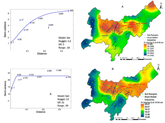 where > 0 represents the variance, > 0 is the shape parameter, > 0 represents the scale (or range) of parameter, (.) forms the modified Bessel function of the second kind order, (.) represents the gamma function, while and constitute the norm of vector h, v = 0.5. Further, the Matern model is the exponential model, while the Gaussian model represents a limiting case of the Matern model when n tends to infinity [50]. The variograms were calculated for the nine different parameters of soil at the three soil depths. The maximum sample variogram distance, taken from 1/3 of the range parameter, sill displayed the spatial autocorrelation component. The nugget parameter was assumed as the mean of the first three sample variogram values. The partial sill was assumed to be the mean of the last five sample values of the variogram and scaled through variance values. Furthermore, based on estimation and the smallest RMSE, the Matern variogram was considered as a suitable model to predict the spatial surfaces of heavy metals’ concentration, except for Cr (15–30 cm), for which the spherical variogram was selected as the suitable model.