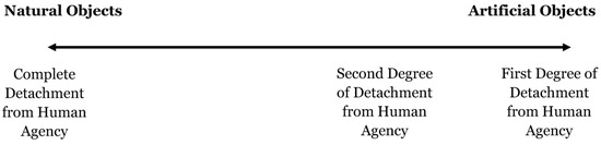 Rather than imposing a strict division between natural and artificial objects, I propose that the artificial/natural distinction be described as a continuum whereby phenomena are branded as more (less) natural or more (less) artificial, depending on their degree of detachment from intentional human agency. It will be useful to distinguish objects that remain completely detached from human agency from those which have a first or second degree of detachment. These divisions are represented in Figure 1, below.