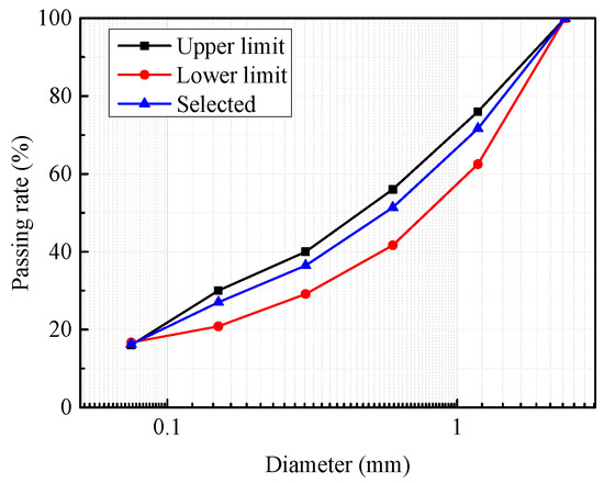 The optimal asphalt content was determined according to Chinese Standards Specification (JTG F40-2004) [20]. Asphalt binders were assumed to be uniformly dispersed in sand asphalt. Also, the asphalt content changed linearly with the specific surface area of aggregates. Subsequently, the optimal asphalt content, Pa, could be calculated as follows: