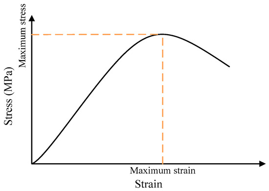 The uniaxial compression failure test is widely used to evaluate the stress-strain relationship and compression strength of asphalt concrete under a constant loading rate [5], which is conducted through servo-hydraulic test systems. The sample was placed at the center of a base steel plate and compressed by a pressure plate. Testing temperature was room temperature (21 °C ± 1 °C), and loading rates were 2 mm/min, 10 mm/min, and 20 mm/min. Each sand asphalt group was tested with four specimens. There were three replicates for each group of samples, and the mean value was calculated to represent the mechanical property of sand asphalt. A stress–strain curve could be obtained by this test, and the typical curve is shown in Figure 3. The maximum stress (namely, compression failure stress), maximum strain (namely, the strain corresponding to the maximum stress), and the secant modulus (namely, the ratio of the compression strength to the corresponding strain) were selected for further comparative analysis.