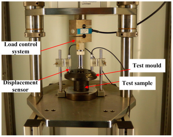 The creep test is an important test method to investigate the deformation property of asphalt concrete [15,25]. It can be used to reflect the viscoelastic property of asphalt materials. A uniaxial compression repeated creep-recovery test was conducted under cyclic loading-recovery with a servo-pneumatic universal testing machine (NU-14, Cooper Technologies Ltd., UK), and the test temperature was 30 °C. Loading was applied with a servo-pneumatic system, and deformation was recorded by two LVDTs (linear variable differential transformers), as shown in Figure 4. Three stress levels, namely 0.12 MPa, 0.36 MPa, and 0.72 MPa, were conducted in this experiment. At the same stress level, each sand asphalt group was tested with four specimens; the result is the average of four data. Both the loading and recovery times were 1 s. The number of loading cycles was set to be 2000 for all of the samples, which meant that the cumulative creep duration and the recovery duration were 2000 s. A strain-cyclical numbers curve could be obtained after each test.