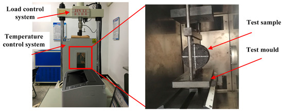 A low-temperature splitting test is a relatively simple method to evaluate the low-temperature performance of an asphalt mixture. In this experiment, the low-temperature splitting test was used to investigate the indirect tensile failure property of sand asphalt. The splitting strength RT was used to reflect the mechanical properties of sand asphalt, which could be calculated using Equation (3), according to Chinese Standard Specification (JTG E20-2011 2011) [26]. The test temperature was −10 °C, and the loading rate was 1 mm/min. The test specimen was a cylinder with a diameter of 100 mm and a height of 63.5 ± 2 mm, with four test specimens for each test. A material mechanical testing machine was used to conduct the test, as shown in Figure 5.
