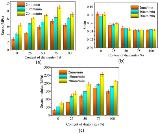 As can be observed from Figure 6, the failure stress and secant modulus of the sand asphalts increased as the diatomite content increased, whereas the failure strain decreased as the diatomite content increased. Also, the extreme points were at approximately 75% diatomite content, from three parameters. The failure stresses of AM-75 were 2.63, 2.03, and 1.74 times higher than AM-0, corresponding to loading rates of 2 mm/min, 10 mm/min, and 20 mm/min, respectively. The failure strength of sand asphalt significantly improved through the addition of diatomite. The failure strain ratios of AM-75 to AM-0 were 0.52, 0.55, and 0.53, corresponding to loading rates of 2 mm/min, 10 mm/min, and 20 mm/min, respectively. The deformation ability under loading appeared to decrease with the addition of diatomite. In contrast, loadings of AM-75 and AM-0 were different when samples were damaged, which resulted in low deformation. Therefore, the secant modulus was a significantly reliable parameter to evaluate the deformation coordination ability of the sand asphalt. As shown in Figure 6c, the secant modulus ratios of AM-75 to AM-0 were 5.03, 3.68, and 3.31, corresponding to the loading rates of 2 mm/min, 10 mm/min, and 20 mm/min, respectively. The secant modulus apparently increased through the replacement of diatomite, which indicated that the deformation coordination abilities of sand asphalts were improved by diatomite. In previous studies, it was demonstrated that the diatomite asphalt mastic that was presented improved high and medium temperature performances compared with the limestone asphalt mastic [10]. The softening point, viscosity, and complex modulus of the asphalt mastics effectively increased through the addition of diatomite [9,10]. Consequently, the failure strength and secant modulus of the sand asphalts were improved through the replacement of diatomite.