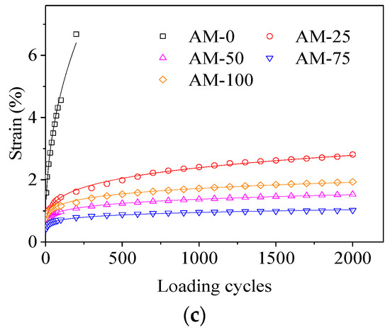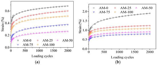 As shown in Figure 8, the creep strains of AM-0 were the highest among the five groups, whereas the creep strains of AM-75 were the lowest under stress levels of 0.36 MPa and 0.72 MPa. Besides, the creep stains of the five groups arranged from the highest to the lowest were AM-0, AM-25, AM-100, AM-75, and AM-50 under the stress level of 0.12 MPa. It appeared that the creep strain decreased firstly, and consequently increased as the diatomite content increased. Furthermore, the optimal replacement content of diatomite was approximately 0.75. This mainly occurred because the addition of diatomite improved the adhesive force between the asphalt binder and the aggregate through enhancing the deformation resistance of the sand asphalt [10]. In contrast, the asphalt content was constant for the five different sand asphalts. Diatoms skeletons are honeycomb silica structures that give diatomite useful characteristics, such as high absorptive capacity and a big surface area [29]; so, the higher the diatomite amount, the higher the amount of adsorbed asphalt. Therefore, the effective asphalt binder in the sand asphalt was insufficient when the content of diatomite was too high, which resulted in the creep strain increments of sand asphalt. It could also be observed that the creep strains significantly increased as the stress level increased, as shown in Figure 7. The creep strain of AM-0 was too high to be measured with the test system subsequent to 200 loading cycles under the stress of 0.72 MPa, which was probably because AM-0 was damaged under the stress level at 30 °C. The curves of the creep strain versus the loading cycles could be described quite well by a power function. The function is shown in Equation (5), and the corresponding regression results are listed in Table 6.