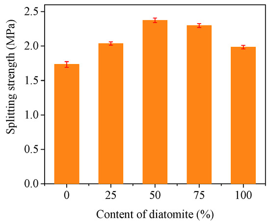 It can be seen from Figure 9 that the splitting strength of the sand asphalts showed a parabolic growth trend as the diatomite content increased. The extreme point was at approximately 50% diatomite content. The splitting strength of AM-50 was 1.37 times higher than AM-0. The tensile failure process could be indirectly simulated by a low-temperature splitting test; this is an indirect process that reflects the low-temperature crack resistance property of the asphalt mixture. The higher the splitting strength, the better the low-temperature crack resistance. Therefore, the low-temperature crack resistance could be improved by the addition of diatomite. This improvement is mostly because the adhesion of diatomite asphalt mastic is significantly higher than that of limestone asphalt mastic [9,10]. However, the asphalt content was constant for all of the groups of sand asphalt, while the asphalt absorption of diatomite is much higher than that of limestone. The free asphalt is insufficient when too much limestone is replaced by diatomite, which results in the decreasing of the splitting strength of the sand asphalt when the addition of diatomite exceeded the optimum content.