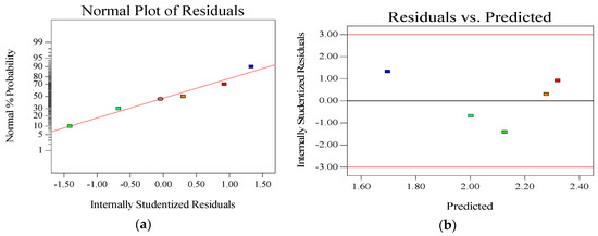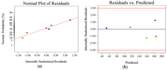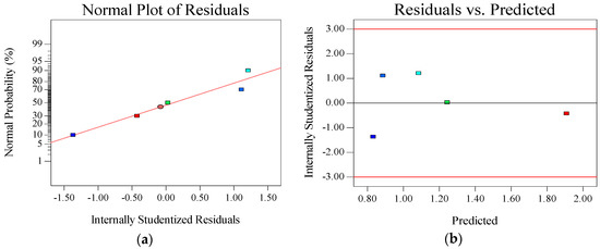 The p-value displayed the probability of the mechanical and deformation properties of the sand asphalt being affected by its main composition during the sample preparation. The terms, which had p-values below 0.05, presented a significant effect on the mechanical and deformation properties of the sand asphalt. The results of ANOVA indicated that all three models were significant. Besides, the content of diatomite (A) and the content of limestone (B) were the most significant factors affecting the secant modulus and creep strain. In the case of the creep strain, independent components and a two-level interaction of components (AB) were the significant factors. To verify the ANOVA, plots of the normal probability of residuals, and the residuals versus the predicted value for the secant modulus, creep strain, and splitting strength were generated and are shown in Figure 10, Figure 11, Figure 12 and Figure 13, respectively. The normal probability plots for all of the parameters presented straight lines, which indicated a normal distribution of errors. The internally studentized residuals were between −2 and 2, which meant that the residuals were fulfilling requirements, and had no pattern. The validations demonstrated that the ANOVA analyses were successful [16]. The final mathematical models that were associated with the responses in terms of their actual factors are presented in Equations (6)–(8). The results of the secant modulus, creep strain, and splitting strength could be predicted when the contents of diatomite and limestone were definite, according to Equations (6)–(8), respectively.