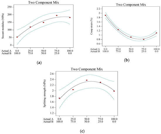 where Y is an estimated response including secant modulus, creep strain, and repeated creep strain; A is the volume content of the diatomite; B is the volume content of the limestone; and a1, a2, and a12 are the constant coefficients for the linear and non-linear terms that were calculated from the experimental results through ANOVA. Both the direction and magnitude of the constant coefficient indicated the effect and impact of each term on the response [16].