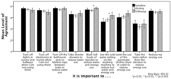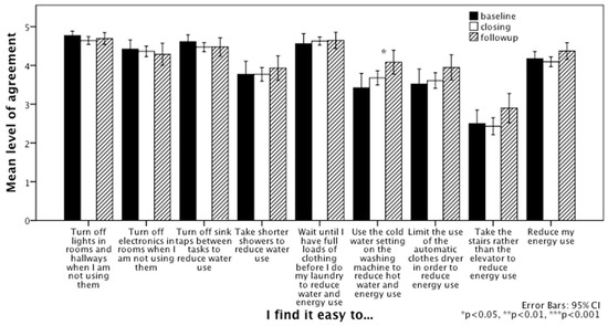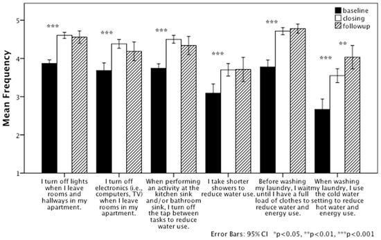 The first nine questions directly asked how often the participant performed a specific pro-environmental behavior assessed on a 5-point Likert scale from 1 (never) to 5 (always). For example: Please indicate how often you do the following: I turn off lights when I leave rooms and hallways in my apartment. These questions averaged at the 3 time points were used to determine the persistence of post-intervention behavioral change.