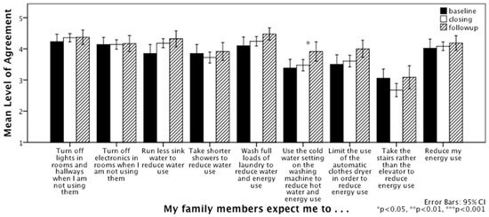 These nine questions assessed how strongly the participant felt that there was an expectation in their family culture to perform specific behaviors, assessed on a 5-point Likert scale from 1 (strongly disagree) to 5 (strongly agree). For example: Please indicate your level of agreement with the following: My family members expect me to turn off lights in rooms and hallways when I am not using them. These questions and how they changed over the course of the intervention gave an indication of how the program impacted family members and therefore gave an indication of the proliferation beyond the target individuals.