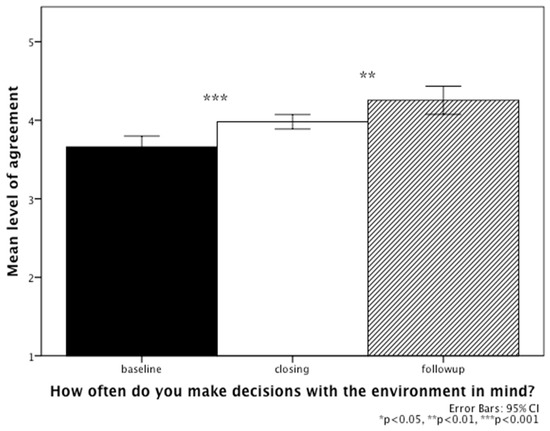 1]. During the 7-month follow-up phase there were no significant changes as compared to program closing, suggesting that the individuals had made durable pro-environmental behavioral changes that had persisted long-term without further intervention. These results are in agreement with the theoretical literature, which postulates that techniques that create an internal change, or a personal norm, such as a commitment, or perceived social norms should be better at creating persistence than more external techniques such as incentives [