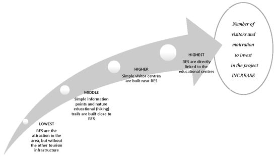 Starting from Beer et al.’s [] proposal, which demonstrated the interaction between tourism and RES, we test if it will be possible to achieve the greatest number of visitors in the case that the type of tourism involved is cycle tourism and the ecomuseum is based on RES. At the same time, we will try to understand if the increasing number of visitors has, as consequence, a greater level of interest in investing in the project by the municipalities and the energy companies. Figure 2 shows the proposed categorisation of Beer et al. [] of the common interactions between RES and tourism. From the lowest to the highest levels of interaction, the number of visitors, and therefore motivation to invest in the project, increases.