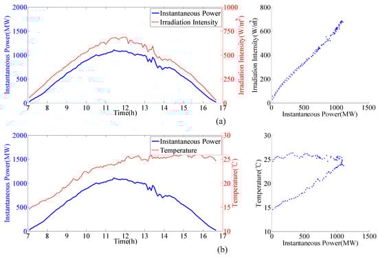 Specifically, these meteorological data include the irradiation intensity, temperature, wind speed and direction, etc. In theory, meteorological factors, especially the irradiation intensity and temperature, have influence on the instantaneous power generation of a PV power station. Figure 2 shows the curve and scatter of the irradiation intensity, temperature and instantaneous power under different sunny and cloudy days. From the scatter diagram, an obvious linear relation between radiation intensity and instantaneous power is shown on both sunny and cloudy days. However, there is not a clear relationship between temperature and instantaneous power. Meanwhile, weather type has a certain influence on this relationship. For example, the scatter points are more concentrated on sunny rather than cloudy days. Therefore, a strong positive correlation exists between the radiation intensity and instantaneous power, while temperature has a weaker correlation with instantaneous power.