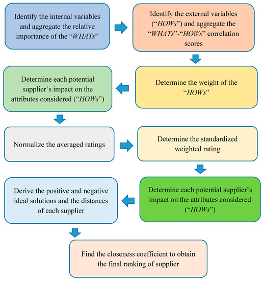 Many researchers and practitioners have proposed various MCDM models to evaluate and choose appropriate supplier. Among them, analytic hierarchy process (AHP) [32,33,34,35], Analytic Network Process (ANP) [36], Technique for Order of Preference by Similarity to Ideal Solution (TOPSIS) [37,38,39], Quality Function Deployment (QFD) [10,40,41,42,43]; AHP-TOPSIS combined approach [44,45,46], QFD and Step-wise Weight Assessment Ratio Analysis (SWARA) [1], AHP and VlseKriterijuska Optimizacija I Komoromisno Resenje (VIKOR) [47], AHP and QFD [2,48], QFD and MCDM [49]; AHP-TOPSIS-QFD [50] have been successfully applied to optimize the supplier evolution process.