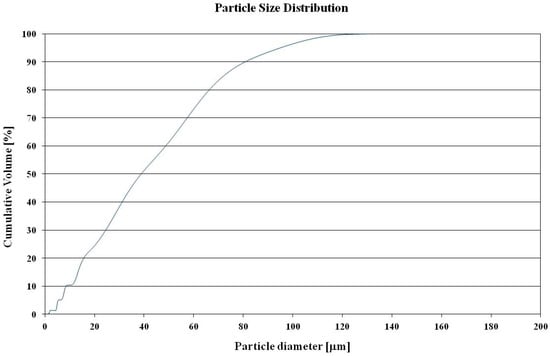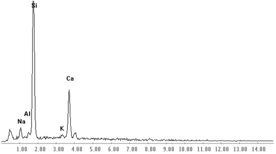 The waste glass is obtained from municipal recycling containers. Figure 1 shows the X-ray diffraction pattern of the glass powder. No peaks attributed to any crystallised compound can be identified except a broad diffraction halo (amorphism of between 20° and 30°), which is attributed to the glassy amorphous phase. The results of the scanning electron micrograph (SEM) and X-ray EDS (energy dispersive spectroscopy) analysis are shown in Figure 2 and Figure 3, respectively. SEM examinations indicated that the glass powders consist mainly of angular flaky particles. Figure 4 shows the particle size gradation curve of glass powder used in the experimental program. The physical and chemical composition of this addition is shown in Table 1.