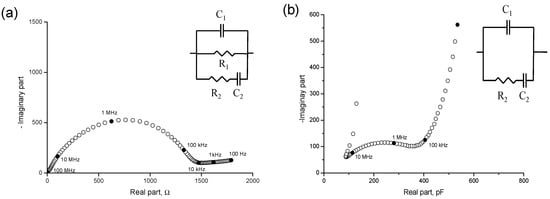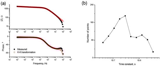 The Kramers–Kronig (K–K) relations [39] (see Figure 6a) were used in order to validate the measurements. Moreover, the differential impedance analysis was applied to them (see Figure 6b) for checking the validity of the equivalent circuits used [36,40]. The impedance parameters R2, C1, and C2 are present in both contacting and non-contacting methods (see Figure 5); here, only their values obtained using the non-contacting method have been analysed because of the greater accuracy.