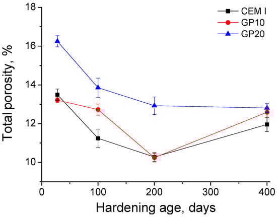 The results of total porosity for CEM I, GP10, and GP20 mortars can be observed in Figure 7. The porosity was reduced from 28 to 200 days for all the studied mortars and stayed nearly constant or rose slightly between then and 400 days depending on the mortar type. Until 200 days, the highest values of total porosity were noted for GP20 mortars, and they were similar for both CEM I and GP10 specimens, although the decreasing rate of this parameter was slower for GP10 ones. Despite that, there were only scarce total porosity differences after 400 hardening days for the three kinds of mortars studied.