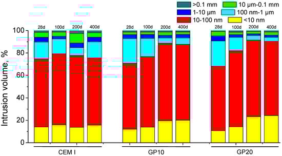 The pore size distributions noted for the analysed samples are depicted in Figure 8. At 28 days, the microstructure was more refined for CEM I mortars compared to those with glass powder, as indicated by their higher relative volume of pores with sizes lower than 100 nm. However, the pore network of CEM I mortars hardly changed with time, while it became progressively more refined for GP10 and GP20 ones. Therefore, after 100 hardening days, the pore size distributions were very similar for all the studied mortars, and at 200 and 400 days the microstructure refinement was greater for specimens with glass powder, especially for GP20 ones.