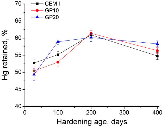 The results of percentage of Hg retained in the samples at the end of the test are shown in Figure 9. In general, for all the studied mortars, this parameter increased with age up to 200 days and stayed practically constant or hardly decreased from then to 400 days. At 28 days, the greatest Hg retained values corresponded to CEM I mortars, although in the middle and long term, they were similar for all the studied mortars, or even slightly higher for the waste glass powder ones.