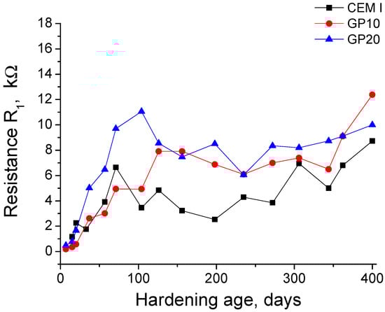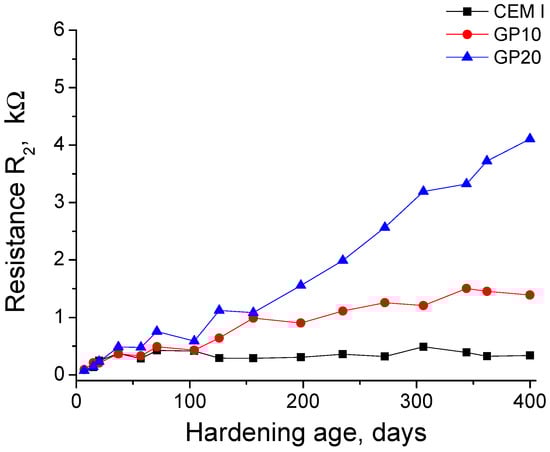In relation to resistance R2, its evolution can be observed in Figure 11. At very early stages, this resistance was very similar for all the studied samples. However, as happened with resistance R1, the increasing rate of R2 was higher for glass powder mortars in comparison with CEM I ones. As a consequence, since approximately 50 days, the greatest R2 values were noted for GP20 mortars, followed by GP10 ones, whereas the lowest resistances R2 corresponded to CEM I specimens, which hardly changed with time.