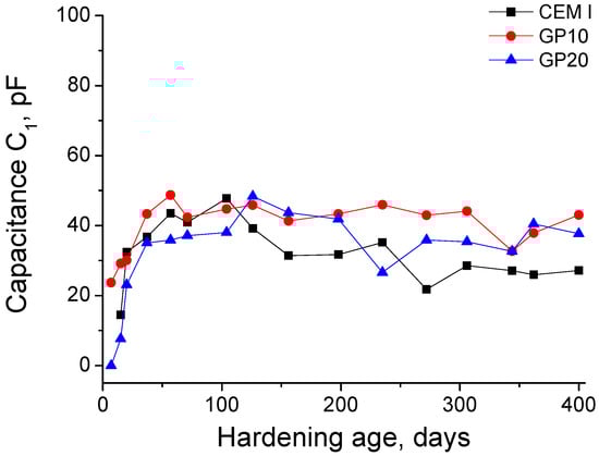 The evolution of capacitance C1 is depicted in Figure 12. This parameter was generally similar for the three kinds of mortars analysed. This capacitance increased quickly at the early stages, although it hardly changed from approximately 80 days. In the short term, the lowest capacitances C1 were noted for GP20 mortars. However, from 120 days the values of this parameter were slightly higher for mortars with glass powder compared to CEM I ones.