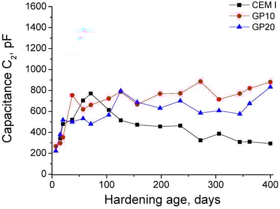 The evolution of capacitance C2 is shown in Figure 13. This parameter mainly rose until 100 days for CEM I mortars and up to approximately 150 days for those with glass powder. Until 100 days the values of this capacitance were very similar for CEM I and GP10 mortars, while they were lower for GP20 ones. Since 150 days, the capacitance C2 rose slightly for GP10 and GP20 mortars and hardly changed for CEM I ones. In the middle and long term, this parameter was greater for glass powder mortars.
