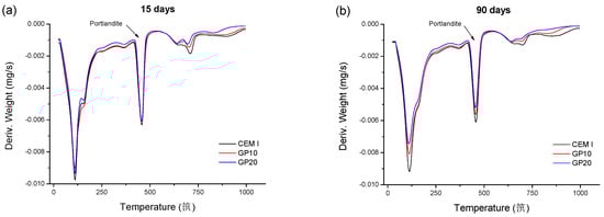The derivate of weight versus temperature curves obtained for the studied mortars at 15 and 90 hardening days are shown in Figure 14. The area of Portlandite peak of this curve was similar for all the studied mortars at 15 days, as can be observed in Figure 14a. Nevertheless, at 90 days (see Figure 14b) this area was lower for mortars with waste glass powder, especially for GP20 ones.
