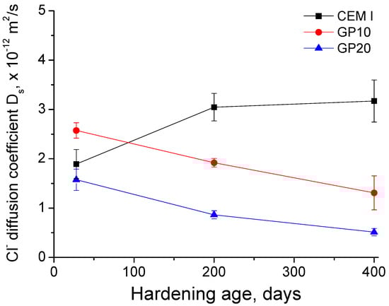 The evolution of the steady-state chloride diffusion coefficient obtained from saturated sample’s resistivity is shown in Figure 15. This parameter hardly rose with hardening age for CEM I mortars, while it decreased for GP10 and GP20 ones. At 28 days, the diffusion coefficient was similar for CEM I and GP20 samples, and greater for GP10 ones. Since then, the mortars with glass powder showed the lowest values of this coefficient, especially GP20 ones.
